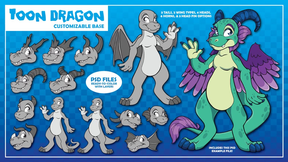 Create your own adorable dragon adoptables, OCs and fursonas with this fully customizable base! Download includes a high resolution PSD, highly organized and ready for you to color and add your own patterns.